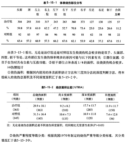 由表5-15-3看出,兩組病人重度和特重度燒傷均占較高比例,即治療組燒傷總面積大于50%BSA者,或是Ⅲ度燒傷面積超過20%BSA者已達(dá)75例;對照組31例,分別占各組例數(shù)的20.7%和21.3%,或者說,兩組重度以上燒傷病例已超過或接近總例數(shù)的40%。他們中最大燒傷面積者達(dá)94%BSA,同時Ⅲ度面積達(dá)73%BSA。由此說明,無論是治療組還是對照組,傷情都是相當(dāng)嚴(yán)重的,而目前在國內(nèi)外的治療難度也是相當(dāng)大的。