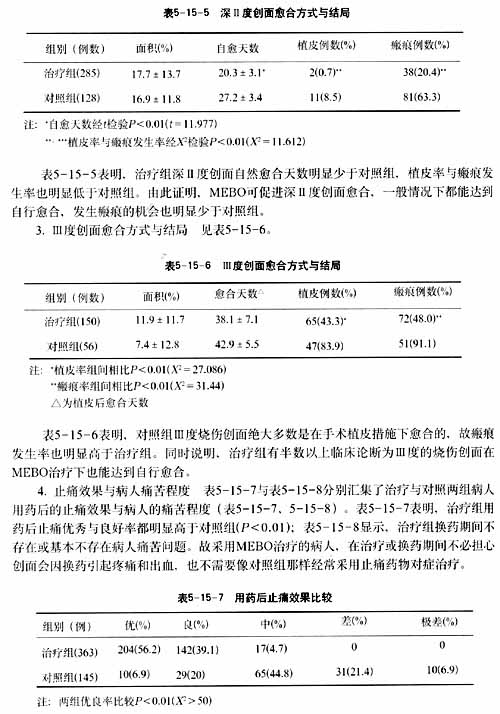 表5-15-9表明,對照組創(chuàng)面感染率明顯高于治療組,說明MEBO不僅不會增加燒傷創(chuàng)面感染機(jī)會,反而會降低其感染率。