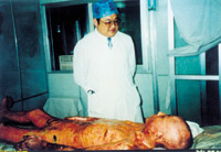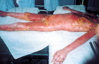燒傷濕性醫(yī)療技術用于治療大面積燒傷,一般不受醫(yī)療條件的限制,只要該醫(yī)院具備一般外科治療條件,均可進行大面積燒傷治療,特別是不強調無菌隔離環(huán)境條件,只強調室內溫度和細心的護理,及時清理創(chuàng)面液化物,遵循外科系統(tǒng)治療原則,均能立足于本單位條件搶救治療大面積燒傷。下圖是燒傷濕性醫(yī)療技術發(fā)明人徐榮祥教授在治療查看燒傷總面積100%的深度燒傷病人時的情景。