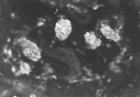 用特異的小鼠抗人角蛋白19型的單克隆抗體(McAb)對(duì)正常和燒傷皮膚免疫細(xì)胞化學(xué)觀察結(jié)果表明,兩例正常皮膚表皮再生干細(xì)胞數(shù)量較少,可見少量顯示熒光的表皮細(xì)胞再生干細(xì)胞(圖5-4-1),即角蛋白19型陽性細(xì)胞。燒傷后24h,熒光顯微鏡下,顯示熒光的表皮再生干細(xì)胞數(shù)量中等程度(圖5-4-2),燒傷后4天,在汗腺、毛細(xì)血管和毛囊周圍可見開始增多的潛在表皮干細(xì)胞(圖5-4-3)。