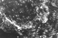 2. 生物素—抗生物素蛋白DCS體系間接免疫熒光染色 先將冰凍切片用10%的馬血清于4℃孵育20min,然后滴加1:20稀釋的小鼠抗人角蛋白19型單克隆抗體(第1抗體)4℃孵育過夜。切片在磷酸緩沖液中涮洗后加第2抗體,即7.5礸/ml生物素化的馬抗小鼠IgG抗體(Vector Laboratories Burlingame, CA, USA),4℃孵育1h。涮洗后,加10礸/ml熒光素-抗生物素蛋白DCS(Vector Laboratories Burlingame, CA, USA)于4℃孵育1h。將切片涮洗干凈后,用含10%PBS和1%對(duì)苯基二胺(P-phenylenediamine)的甘油做介質(zhì)封片。對(duì)照染色切片,則不加第1抗體。標(biāo)本在Olympus反射式熒光顯微鏡下觀察,并用ASA400 KODAK膠卷照相。