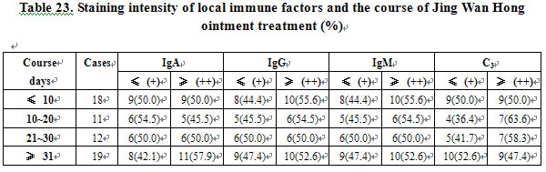There was no positive correlation between the Jing Wan Hong ointment treatment and the staining intensity of local IgA-, IgG-, and IgM-producing cells and C3 (P>0.05). Changes in staining intensity of immune factors were not attributed to Jing Wan Hong ointment (Table 23).
