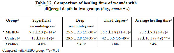 In the MEBO group, burns wounds with different depths had shorter healing time than those in the control group (P<0.01; Table 17). Only one case (1.7 %) in the MEBO group had wound infection, compared to 9 cases (15 %) in the control group. The difference between the two groups was significant (2=5.35, P<0.05). MEBO was proved to have infection-controlling and healing-promoting effects.