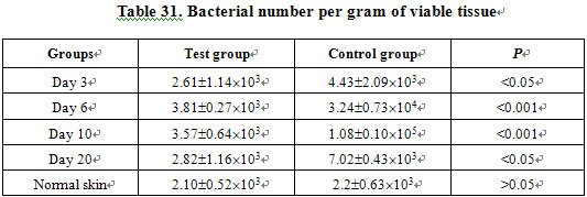 The bacterial number in viable tissues of burns wounds was less than 104/g in both groups, indicating there was no wound invasive infection during the whole test period. However, the bacterial number in wound viable tissue of the test group was significantly less than that in the control group at each observation time (Table 31).
