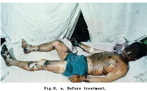 On admission, the patient was in a critical state and in shock. The extensive deep burns wounds were covered by cement powder. He had inhaled cement and his nasal hairs were singed. He suffered from respiratory abnormality and hoarseness. Tracheotomy was performed immediately. BRT with MEBT/MEBO treatment and cultivating technique was started on the wound and systemic comprehensive management begun. Histological examination of the wound skin showed third-degree burns. On day 30 postburn, liquefaction and discharge of wound necrotic tissues were finished. On day 49 postburn, newly regenerated skin was present on the wounds. Ten days later large sections of regenerated skin appeared on the wounds and all wounds had healed completely on day 72 postburn. One year later, follow-up showed the patient free of disablement, capable of independent viability and no need of reconstruction.