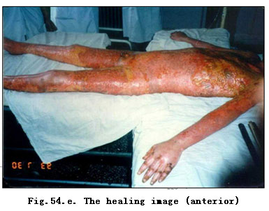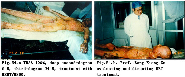 Remarkably, rigorous sterile conditions are not required if burns regenerative medicine therapy (MEBT/MEBO) is used in the care of extensive burn patients. Basic equipment and general surgical conditions typically suffice. However, ambient room temperature of 32 - 36 C and careful, well-trained, intelligent nursing care are required so that removing liquefied product in a timely manner is accomplished. In general, surgical principles of systemic comprehensive treatment should be followed. Figure 54 a-e shows Prof. Rong Xiang Xu, inventor of burns regenerative medicine and therapy (MEBT/MEBO), as he assesses and directs the treatment for a burns patient with deep burns of TBSA 100 %.