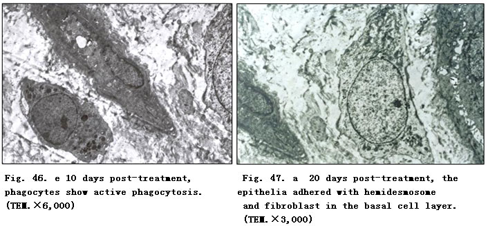 Twenty days post-treated, we noted the appearance of the hemidesmosome junction between the basal cell layer and epithelia. Active mitochondria and RER in fibroblasts also appeared (Fig. 47. a-c).