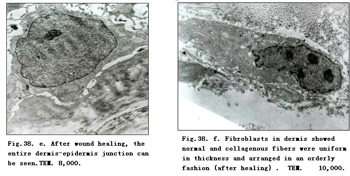 The chondriosome was rich and intracytoplasmic tonofibril showed an increase in cytoplasmic presence. Also, we observed a gradual establishment and improvement of the intercellular desmosomal junction. After healing, neoformative epidermis cells and intercellular junction recovered almost to normal and the integrated dermis-epidermis junction reappeared (Fig.38. e). The majority fibroblasts in the dermis appeared as long strip rich in cytoplasm with well-developed organelles. However, no additional active metabolism of the same was observed. Fibroblasts were uniform in thickness, fasciculated and well orientated (Fig.38. f). The healing skin of deep second-degree wounds became almost identical to that of noninjured skin (Fig.38. g).