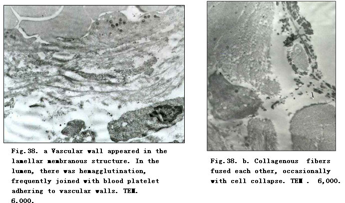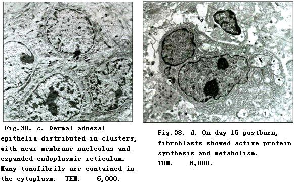 On day 1 postburn, electron-microscopic observation indicated loose and disorderly arranged collagenous fibers in the superficial dermis, and a distinct and recognizable light-dark zone of the fasciculus. Fibroblasts which had a cytomembrane profile which remained the same although being deprived of the cell organ. Nuclear membrane loomed with increscent nucleopore to cause the interpolation of nuclein and chromatin, leading to lumpish chromatin. Microangial endothelia had similar changes as did the fibroblasts. The vascular walls appeared as a lamellar membranous structure. In the lumen, we noted hemagglutination, frequently joined with blood platelet adherence to the vascular walls (Fig.38. a). On day 3 postburn, collagenous fiber bundles in the superficial dermis varied in thickness and appeared disorderly with faint or absent light-dark zones. The cell ultrastructure interwoven between fibers disappeared. On day 5 postburn, the superficial collagenous fibers merged to produce floccules with high electron density surrounded by scattered electro-dense organelle-like structures and necrotic cell fragments as well as occasionally by varied lower electodense lipid droplets without coating of the limiting membrane (Fig.38. b). On day 7, when the ultrastructure change of the superficial dermis was similar to that on day 5, deep collagenous fibers and the structure of dermal adnexal epithelia nearly returned to normal, except for a slight broadening of the intercellular space. On day 10 postburn, fibroblasts in the dermis showed condensed nuclear chromatin, hypertrophic and shift aside nucleoli. Rough endoplasmic reticulum (RER) proliferated showing flat vesicular and vesicular-like expansion, while residual dermal adnexal epithelia were distributed in clusters containing a high amount of tonofibril (Fig.38. c). On days 15 and 20 postburn, collagenous fiber bundles of dermis varied in thickness and appeared disorderly; fibroblasts were binucleated and showed obvious nucleoli with the presence of karyosome; perinuclear pool demonstrated beading swelling and the RER proliferated (Fig.38. d). In dermal adnexal epithelia, nucleoli were distinct and increased numbers of karyosomes were frequently observed.