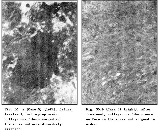 Electron Microscope: Before treatment, fibroblasts showed disrupted karyomorphism, contracted nucleoli, expanded perinuclear space and paranuclear vacuolar degeneration. A faint staining area was observed in the paranuclear margin of mussily arranged fibrocytes. Collagenous fibers varied in thickness with breaking and dissolution. After MEBO treatment, the nucleoli and nuclei of fibroblasts recovered to normal and collagenous fibers appeared to be uniform in thickness and orderly in arrangement. Master cells were occasionally visible after treatment in a few cases. Fibrocytes recovered to normal with orderly arrangement and intracytoplasmic rough endoplasmic reticulum appeared (Table 57).