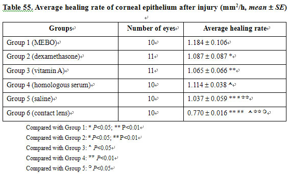 The observation record showed the following mean healing time: 48.6 h in the normal saline group, 47.36 h in the vitamin A group, 45.18 h in the homologous serum group, 42.78 h in the MEBO group, 46.5 h in the dexamethasone group and 65.3 h in contact lens group. The results revealed that there was no significant difference of average healing rate between groups 1 and 4, as well as groups 2 and 4, groups 2 and 3, groups 3 and 5. However, there were statistical differences between other each two groups. MEBO, homologous serum, vitamin A, and dexamethasone had superior healing effects compared with normal saline, while wearing of contact lens retarded the healing of the defect. Beside homologous serum, MEBO is remarkably superior to other drugs in promoting corneal epithelial healing rate (Table 55).