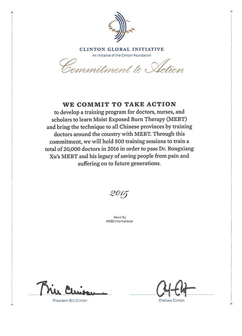 “我們承諾實(shí)施燒傷濕潤(rùn)暴露療法培訓(xùn)項(xiàng)目,將該技術(shù)推廣到全國(guó)各個(gè)省份,為醫(yī)生、護(hù)士以及學(xué)者提供濕潤(rùn)暴露療法的培訓(xùn)。我們承諾,在2016年將會(huì)開(kāi)辦500個(gè)培訓(xùn)班,培訓(xùn)2萬(wàn)名醫(yī)生,將徐榮祥大夫的濕潤(rùn)暴露療法以及其救死扶傷的精神傳承。”
