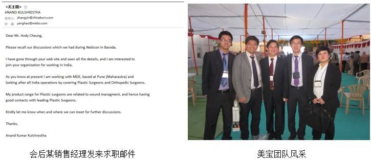 1月25日,大會順利召開,會場內(nèi)氣氛緊張而熱烈,而在會場之外我們又有許多新的收獲,在會場外我與張印經(jīng)理分頭行動,對場外所有的醫(yī)藥行業(yè)參展商進(jìn)行了交流,向他們介紹了再生技術(shù)的優(yōu)勢以及目前我們的技術(shù)在世界范圍內(nèi)的影響,以及目前在世界區(qū)域及印度當(dāng)?shù)氐氖袌銮熬凹耙?guī)劃,并向部分優(yōu)秀人員流露出美寶印度分公司對優(yōu)秀人才的需求,意想不到的是,多名參展銷售經(jīng)理及銷售人員在聽完介紹后,當(dāng)即便流露出加入美寶的意愿,并在會后發(fā)郵件過來表達(dá)自己對美寶的看法及渴望加入到團(tuán)隊中來,這些人員為今后美寶印度分公司的人力資源儲備給予了極大的補充。