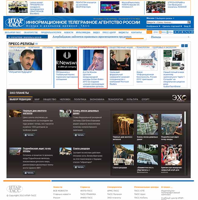 徐榮祥教授喜獲歐洲斯洛伐克Informal Economic Forum (IEF) 經(jīng)濟俱樂部頒發(fā)的2013年“Golden Biatec”國際獎,引發(fā)國際關(guān)注熱潮,不僅美國等美洲國家高度重視,亦對歐洲俄羅斯等國引發(fā)強烈沖擊。徐榮祥獲獎新聞登于塔斯社新聞網(wǎng)站首頁一整天,成為俄羅斯等國當日重大新聞報道,引發(fā)數(shù)百萬人關(guān)注及熱議。