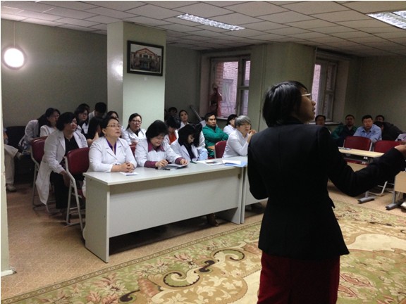 2月20日中午12點,美寶團(tuán)隊來到烏蘭巴托的青格爾泰區(qū)中心醫(yī)院,培訓(xùn)內(nèi)容涵蓋了出席的20位醫(yī)生專業(yè)領(lǐng)域,包括再生療法在糖尿病潰瘍,褥瘡,靜脈潰瘍,創(chuàng)傷,手術(shù)創(chuàng)面及婦科應(yīng)用。醫(yī)生們對展示的典型案例很感興趣,詢問了具體的治療過程,換藥操作,并且又一次表達(dá)了試用疤痕平的愿望。Myadagmaa 醫(yī)生是該院的婦產(chǎn)科醫(yī)生,看到展示的婦科手術(shù)創(chuàng)面的應(yīng)用后,急切的咨詢在婦科方面的其它應(yīng)用,張美艷介紹了再生療法在宮頸電環(huán)切除術(shù),剖腹產(chǎn)手術(shù),腹腔鏡手術(shù),會陰切開術(shù),會陰撕裂傷及宮頸糜爛等方面的應(yīng)用,與醫(yī)生互換了名片,贈送了美寶的學(xué)習(xí)光盤及幾年品,答應(yīng)通過郵件等方式解答病例咨詢及臨床應(yīng)用問題。