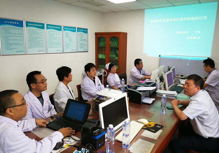 2018年9月19日上午,楊智斌總裁又在陜西中西醫(yī)結(jié)合學(xué)會燒傷專業(yè)委員會劉華秘書的陪同下,對蒲城縣醫(yī)院進(jìn)行參觀訪問。對燒傷科當(dāng)前住院及門診治療的燒傷創(chuàng)瘍病人治療情況進(jìn)行了實地考察,并就雙方進(jìn)一步合作與院領(lǐng)導(dǎo)進(jìn)行了座談。蒲城縣醫(yī)院以付強主任為核心全程規(guī)范應(yīng)用再生醫(yī)療技術(shù)二十多年,治療過的病人效果好、費用低,在渭南地區(qū)形成一定影響力。