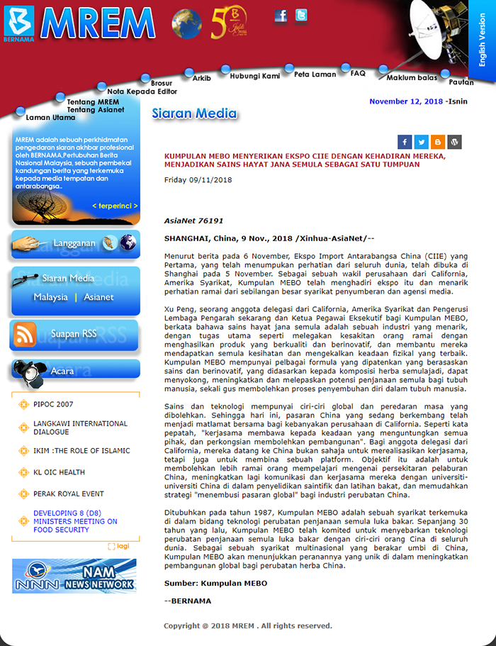 中央視電視臺新聞頻道《朝聞天下》播出的進博會專題新聞讓生活更精彩的眾多全球首發(fā)新產(chǎn)品介紹中,特別提到了美寶首發(fā)產(chǎn)品衡糖膠囊;北京電視臺《北京您早》欄目報道了美寶在進博會的展位和產(chǎn)品,并指出再生醫(yī)學(xué)技術(shù)將服務(wù)更多市民;《中國婦女》雜志就進博會對美寶集團董事局副主席李俐進行了特別報道;新華網(wǎng)專題云視頻“印象進博會“也重點推介了美寶;《經(jīng)濟參考》捕捉到了美寶在中國植物藥的世界化發(fā)展中具有的獨特的價值,特別以“美國再生醫(yī)療保健品亮相首屆進博會 中醫(yī)藥特色魅力成焦點”為題,大篇幅闡述了美寶集團的背景及發(fā)展。