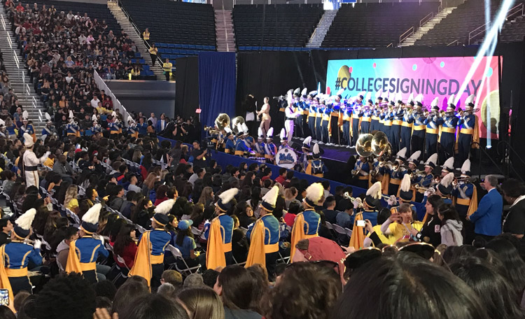2019年5月1日上午,由前第一夫人米歇爾· 奧巴馬創(chuàng)立的大學(xué)定校日活動(CollegeSigningDay)在加州大學(xué)洛杉磯分校隆重舉行,來自全加州眾多高中的上萬名學(xué)生參加了這一盛會。一系列的慶祝表演節(jié)目不?;钴S現(xiàn)場氣氛,加州大學(xué)總校長Janet和洛杉磯分校校長Gene以及一些體育和演藝界明星出場鼓勵學(xué)生,米歇爾· 奧巴馬在會上壓軸出場,發(fā)表十幾分鐘的演講鼓勵中學(xué)生特別是那些低收入家庭的學(xué)生刻苦學(xué)習(xí),努力上大學(xué),創(chuàng)造光明未來。