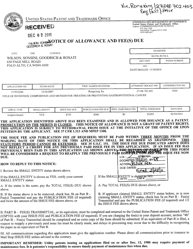在辭舊迎新之際,集團的喜事不斷,禮包不斷,近日,再接到從美國專利局傳來的振奮人心的喜訊,再生生命科學(xué)創(chuàng)始人徐榮祥教授的“治療與預(yù)防胃腸道癌癥方法”的專利已獲得正式授權(quán)。該專利是繼徐教授在獲得系列專利權(quán)之后,在人體再生復(fù)原科學(xué)研究和科學(xué)成果確認的又一重大進展與突破。至此,徐教授已獲得美國、日本、歐洲、加拿大等主要國家23項發(fā)明專利。再一次證實了在生命科學(xué)領(lǐng)域,話語權(quán)牢牢的掌握在美寶人手中,在知識產(chǎn)權(quán)發(fā)展過程中的具有重要意義“治療與預(yù)防胃腸道癌癥配方和方法”是美寶科研成果實際臨床應(yīng)用的重要成就,近年來,胃腸道癌癥的發(fā)病率居高不下,嚴重威脅著人類生命健康,傳統(tǒng)醫(yī)療手段效果不佳。該專利技術(shù)的問世,不啻是為人類健康帶來的天大福音。根據(jù)這一專利開發(fā)的技術(shù)和產(chǎn)品,可以利用人體的再生潛能,為解決人類胃腸提前衰老,治療和預(yù)防癌癥的發(fā)生,為目前醫(yī)學(xué)手段難以解決的胃腸道癌癥預(yù)防與治療提供了全新的解決辦法,以徐榮祥教授為核心的美寶科研團隊在再生生命科學(xué)領(lǐng)域里所取得的這一前沿臨床應(yīng)用成果,為人類再生生命科學(xué)發(fā)展道路上具有新的里程碑式的意義。