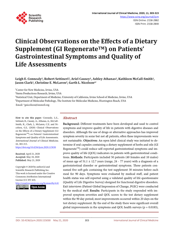 研究中對患有胃腸道疾病或存在胃腸道癥狀的50名患者(40 名女性,10名男性)展開研究。50名患者平均年齡為 51.1±12.7歲(年齡范圍 24至77歲),于每餐餐前 30分鐘服用 5 粒膳食補充劑,共計 90 天。研究期間,患有腸易激綜合征、胃食管反流、克羅恩病、乳糜瀉、潰瘍性結(jié)腸炎、胃炎,以及出現(xiàn)腹脹、腹痛、胃痛、便秘、腹瀉、疲倦、腸脹氣、惡心、反流、食物過敏、吸收不良等消化系統(tǒng)癥狀的患者,均出現(xiàn)顯著的癥狀改善;并且在不適癥狀緩解、日?;顒雍徒箲](p=0.018)方面亦有所改善,提示生活質(zhì)量顯著提升。