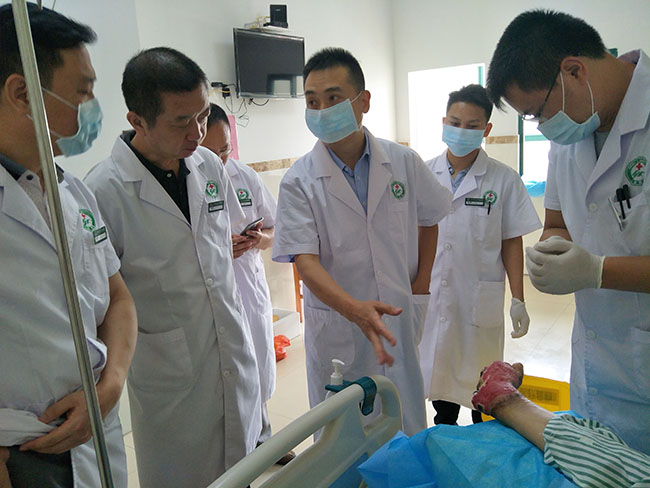 7月8日上午,應(yīng)三水蘆苞眾泰醫(yī)院汪國斌院長的邀請,再生醫(yī)療專家、中國中西醫(yī)結(jié)合學(xué)會(huì)燒傷專業(yè)委員會(huì)常務(wù)委員王洪生等到該院對一位因車禍致嚴(yán)重撕脫傷創(chuàng)面患者進(jìn)行會(huì)診,并現(xiàn)場示范清創(chuàng)和換藥。會(huì)診后給相關(guān)科室及一線臨床醫(yī)務(wù)人員進(jìn)行了再生醫(yī)療技術(shù)在難愈性創(chuàng)面的臨床應(yīng)用授課,此次活動(dòng)對推動(dòng)該院在再生醫(yī)療技術(shù)的臨床應(yīng)用方面起到了指導(dǎo)和帶動(dòng)作用。