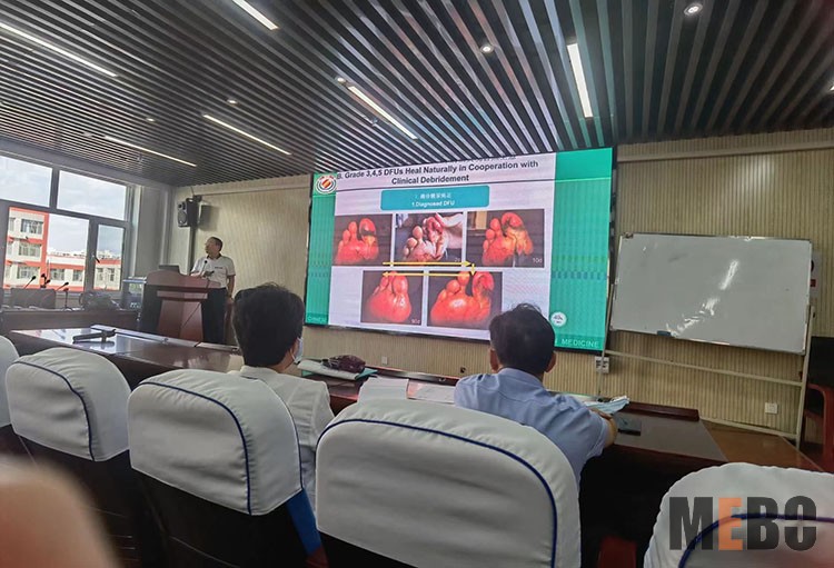 2022年9月6日,中國中西醫(yī)結(jié)合學(xué)會(huì)燒傷專業(yè)委員會(huì)醫(yī)療部張強(qiáng)主任應(yīng)邀到訪湖北宜昌宜都市中醫(yī)醫(yī)院骨外科,在科室張禹副主任主持下,進(jìn)行了《難治性創(chuàng)瘍的治療》講座,講解條理清晰,通過各類治療病例的展示,使理論深入淺出。醫(yī)師們表示受益頗多,并更加了解了再生醫(yī)療技術(shù)的發(fā)展前沿??剖医涣鹘Y(jié)束后,張主任會(huì)診一例骨折后皮膚缺損骨外露患者。張主任建議患者創(chuàng)面應(yīng)用美寶再生醫(yī)療技術(shù)換藥,不僅生肌止痛,而且愈合效果理想,并為大家示范了規(guī)范換藥流程。