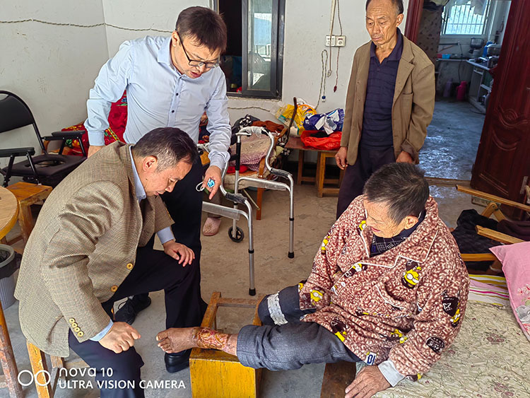 2022年11月7日,北京榮祥再生醫(yī)學研究所副所長、《中國燒傷創(chuàng)瘍雜志》編委金黨軍應江西省贛州市南康區(qū)中醫(yī)院外一科嚴主任的邀請,和江西省辦事處主任陳立新、贛州地區(qū)負責人肖曉春一起來到南康區(qū)中醫(yī)院外一科,在科室主任和醫(yī)生的陪同下一起會診了3例慢瘡(外傷后感染久治不愈、壓瘡、頸部道久不愈合)病人,并親自用再生醫(yī)療技術(shù)為患者規(guī)范換藥,獲得主任和科室醫(yī)護人員、患者家屬的一致好評。