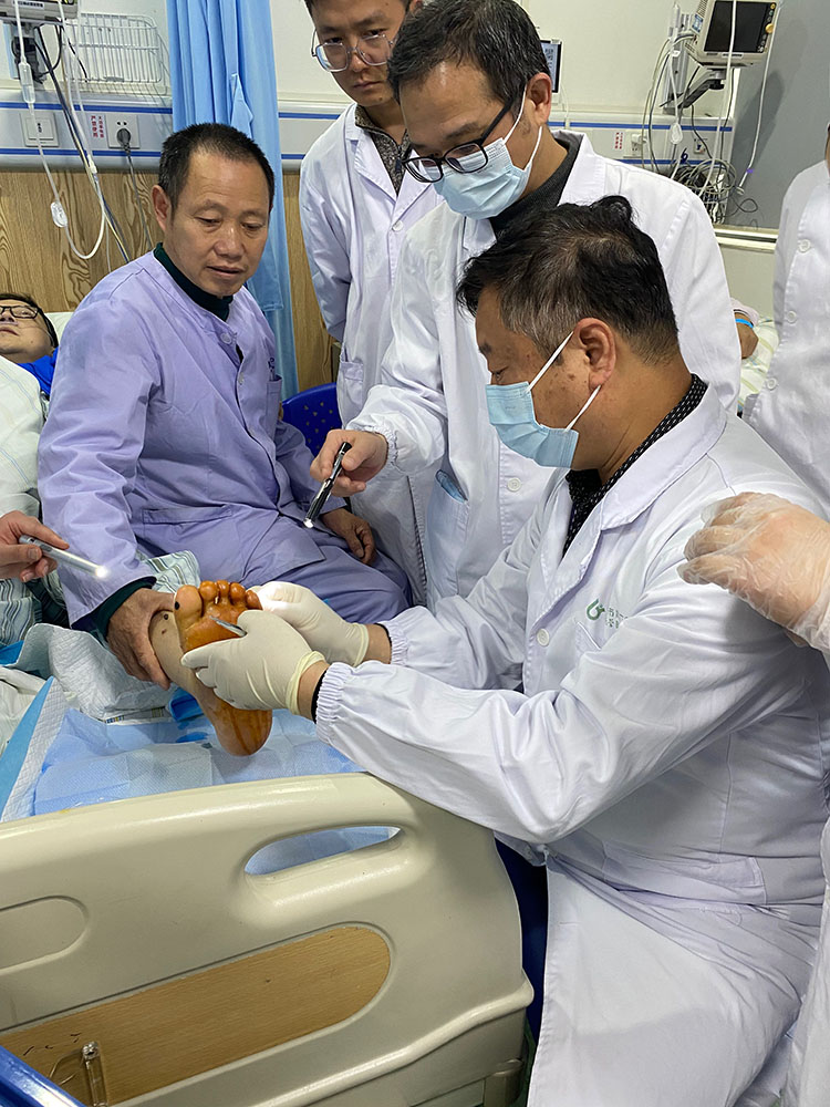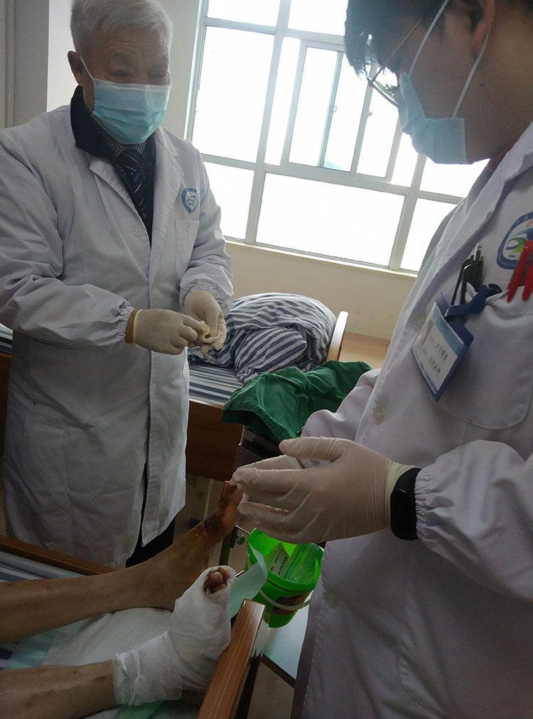 3月25日,中國中西醫(yī)結合學會燒傷專業(yè)委員會常務委員,《中國燒傷創(chuàng)瘍雜志》副總編輯王洪生,應邀到中山沙溪隆都醫(yī)院、中山源田骨科醫(yī)院、東莞濱海灣中心醫(yī)院,給多位糖尿病足、壓瘡等慢創(chuàng)患者進行查房會診,針對不同創(chuàng)面情況提出了相應的治療方案,并就糖尿病足潰瘍等慢性創(chuàng)面不同時期的處理要點進行了分析和指導,得到了醫(yī)護人員和患者家屬的一致好評!
