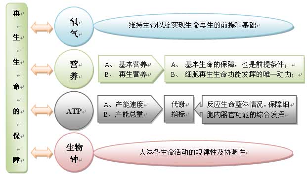 既往我們已經(jīng)知道“氧氣、營養(yǎng)、ATP、生物鐘”是駕馭人體再生生命的四大指標(biāo),也是臨床再生技術(shù)的操作指標(biāo)及人體生命活動的觀察指標(biāo),它們與人體再生生命之間的關(guān)系究竟是怎樣的?如下圖所示。