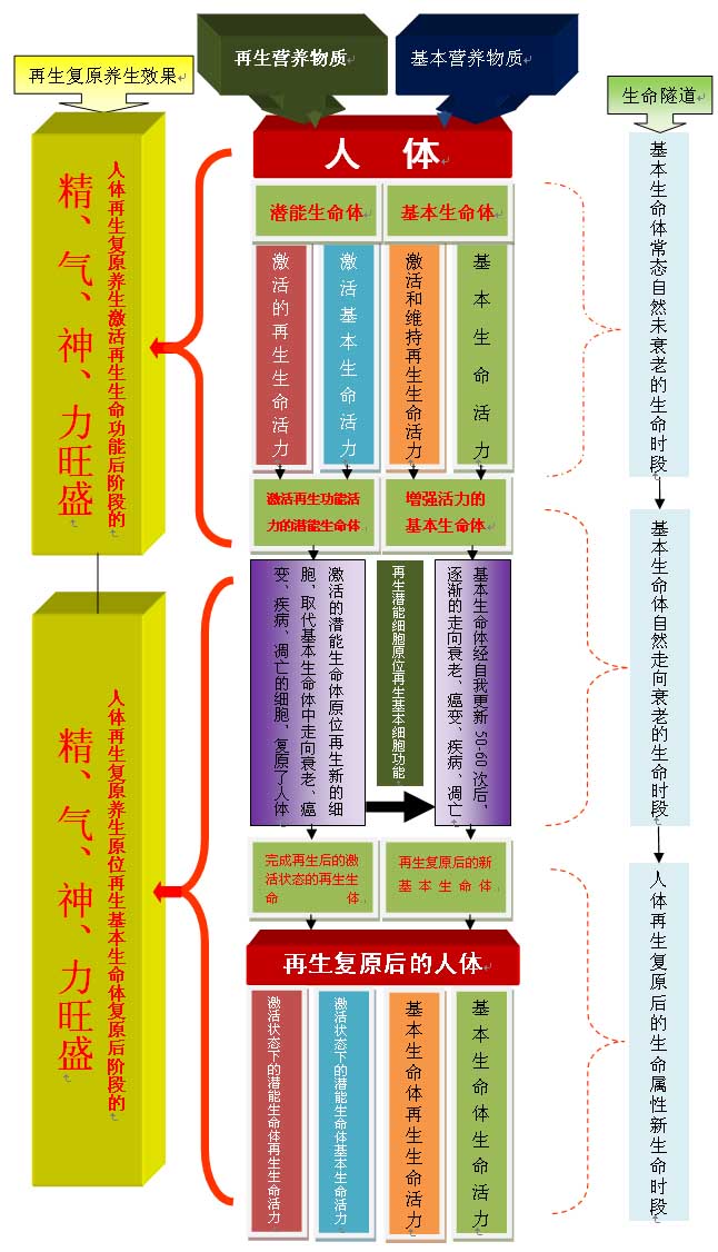 “生命體”、“生命環(huán)境”以及“再生營養(yǎng)”是人體再生復(fù)原的技術(shù)實施前提和基礎(chǔ),結(jié)合運(yùn)用“再生復(fù)原技術(shù)”便可以實現(xiàn)人體生命的“精、氣、神、力”持續(xù)旺盛。其中,“再生營養(yǎng)”是人體再生復(fù)原科學(xué)核心技術(shù)中最重要的組成部分,研究表明,它具備四大功能,第一,啟動并喚醒人體“潛能生命體”的生命功能,使其發(fā)揮基本生命體的生命功能,保障和加強(qiáng)人體基本生命功能的力量;第二,激活并啟動人體“潛能生命體”的再生基本生命體的程序,即當(dāng)“基本生命體”中的細(xì)胞出現(xiàn)衰老、癌變、凋亡、嚴(yán)重疾病這四大死亡程序時,“潛能生命體”可以原位再生一個新的基本生命體,替換(或補(bǔ)充)原來器官組織中因四大死亡程序而導(dǎo)致的基本生命體缺如,從而實現(xiàn)基本生命體的結(jié)構(gòu)完整、生命功能正常;第三、激活“基本生命體”的“再生生命活力”;第四,激活“潛能生命體”的“再生生命活力”。人體再生復(fù)原的核心就是利用“再生營養(yǎng)”的這四大功能,在保障人體“基本生命”的同時實現(xiàn)了人體的“再生生命”及“再生基本生命體”的功能,“潛能生命體”原位再生復(fù)原組織器官的結(jié)構(gòu)、保障和加強(qiáng)組織器官功能的同時,人體原來未發(fā)揮功能的細(xì)胞都參與到了機(jī)體的一線工作當(dāng)中,兩者共同作用實現(xiàn)了超越常規(guī)健康的人體整體生命活力旺盛的表達(dá),即“精、氣、神、力”旺盛。
