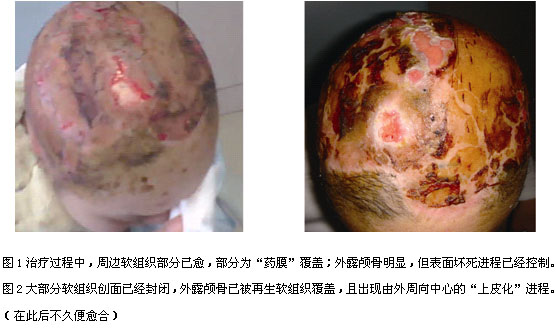 1.2.處理方法:軟組織創(chuàng)面清創(chuàng)后,外用美寶濕潤燒傷膏聯(lián)合黃柏、虎杖等中藥創(chuàng)造組織再生條件進行原位培養(yǎng),藥物厚度約2mm,包扎治療,每12小時換藥一次;顱骨外露處(排出顱骨全層壞死)以無菌紗布蘸除分泌物后,表面用藥同其周邊軟組織,藥量略多,即增加藥膜覆蓋厚度,同樣包扎,12小時換藥一次。換藥時僅以無菌敷料蘸除前次藥物及分泌物等,以創(chuàng)面無明顯滲血為原則。有壞死、脫落的骨片一并去除(如有顱骨穿孔,不再適宜本方案),繼續(xù)同前處理。