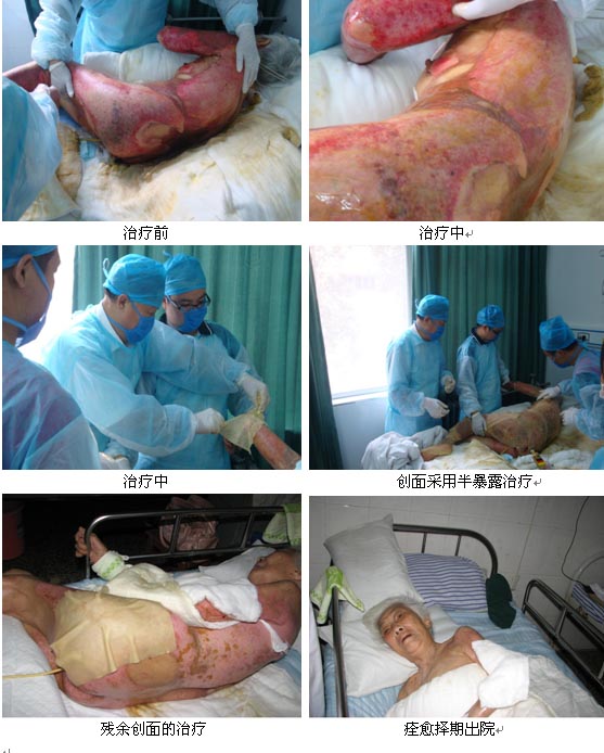 邵陽(yáng)市人民醫(yī)院是今年剛掛牌成立的中心醫(yī)院,在燒傷科掛牌前該院于201086日收治了1例重度燒傷患者,院領(lǐng)導(dǎo)非常重視?;颊邉⒛?,女性,88歲。因腰部疼痛行蒸汽治療時(shí)不慎跌入開(kāi)水中,導(dǎo)致背部、雙側(cè)側(cè)胸、左側(cè)乳房、臀部、會(huì)陰部,左側(cè)上、下肢及右側(cè)大腿后外側(cè)等燙傷,患者傷后1.5小時(shí)入院。入院診斷:特重度燒傷。燒傷面積60% TBSA,III度燒傷面積為15%TBSA;深II度燒傷面積為45% TBSA。患者入院后,醫(yī)院立即靜脈置管建立可靠靜脈通路,并將其轉(zhuǎn)入ICU病房后采用抗休克等綜合治療。中國(guó)燒傷創(chuàng)瘍科技中心臨床部金黨軍教授在接到該院的電話后,立即從湖北趕往邵陽(yáng)為患者會(huì)診。