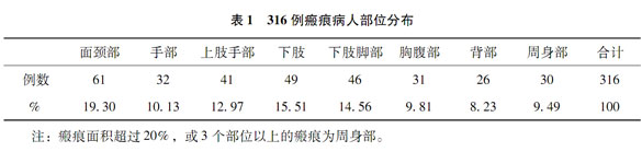 316例病人全部為深Ⅱ度以上燒傷病人,其中男性206人,占65.19%,女性110人,占34.81%,3個月內(nèi)的預(yù)防性應(yīng)用154例,占48.73%。預(yù)防兼治療性應(yīng)用162例,占51.17%,按預(yù)先設(shè)計的治療方法和療效評定標(biāo)準(zhǔn)評定,全部在右效范圍,右效率100%。治療部位見表1。