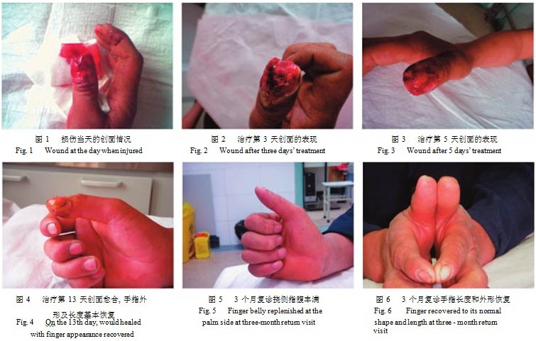 典型病例 1: 患者楊某, 男, 35歲。右手拇指機器挫斷傷疼痛、流血 30min 前來就診。 診斷:右手拇指挫斷皮膚軟組織缺損傷。 患者就診后在局麻下用生理鹽水對創(chuàng)面進行簡單清洗, 對皮膚軟組織裂傷和出血處用絲線行低張力對位縫合止血, 涂上約 2 mm厚的MEBO, 并覆蓋2層MEBO 藥紗后行包扎處理, 前 3d每天復診換藥, 口服抗生素 3d。經(jīng)第 1次處理后創(chuàng)面無繼續(xù)出血, 第3天拆除縫合線, 并改為MEBO 暴露療法治療, 指導和囑咐患者在家進行換藥, 每4 h ~ 6 h清理創(chuàng)面和換藥 1次, 3d ~ 5d 復診1次。 治療過程中始終保持創(chuàng)面濕潤, 換藥過程患者基本沒有疼痛, 治療 13d 創(chuàng)面基本愈合, 手指長度基本恢復, 外形良好。3個月時隨訪, 手指長度、外觀和感覺功能恢復正常( 見圖 1-6) 。