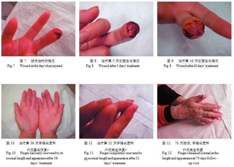 典型病例 2: 患者尼某, 女, 75歲。 因左手中指末節(jié)被鋼門擠壓、組織離斷、 疼痛、 流血15 min 前來就診。患者有糖尿病史5年, 服藥不規(guī)律, 血糖維持在7 mmol / L ~ 10 mmol / L。 診斷:1. 左手中指末節(jié)皮膚軟組織缺損傷; 2.Ⅱ型糖尿病?;颊呔驮\后我們用生理鹽水對其創(chuàng)面進行了簡單清洗, 用紗布壓迫止血后, 涂上約 2 mm 厚的MEBO并覆蓋 2層MEBO藥紗后, 行輕度加壓包扎處理, 經(jīng)第1次的處理創(chuàng)面無繼續(xù)出血, 口服抗生素 3d。 前7d每天復診換藥, 之后指導患者在家進行換藥, 3d ~ 5d 復診1次。始終保持創(chuàng)面濕潤, 換藥過程基本沒有疼痛, 治療 30d創(chuàng)面完全愈合, 手指長度基本恢復, 外形良好。2個月時隨訪, 手指長度、外觀和感覺功能恢復正常, 皮膚彈性好, 無瘢痕 ( 見圖 7-12) 。