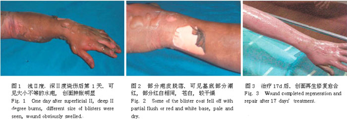 患者創(chuàng)面愈合較快,其中185例Ⅱ度電弧光燒傷創(chuàng)面全部提前愈合,其中淺Ⅱ度創(chuàng)面7d~14d,平均10.64d,深Ⅱ度創(chuàng)面16d~23d,平均18.25d。6例以Ⅲ度燒傷為主的患者均自行愈合,未行植皮手術(shù),41d~58d愈合,平均50.17d。創(chuàng)面換藥過程中,患者痛苦小,特別是在清除壞死組織時基本無痛苦。創(chuàng)面愈合后瘢痕少,皮膚功能無影響。隨機(jī)對18例雙上肢深Ⅱ度燒傷患者隨訪半年,只有個別病例出現(xiàn)色素沉著,愈合創(chuàng)面皮膚均光滑平整,彈性良好,且不影響皮膚美觀,功能良好(見圖1~3)。