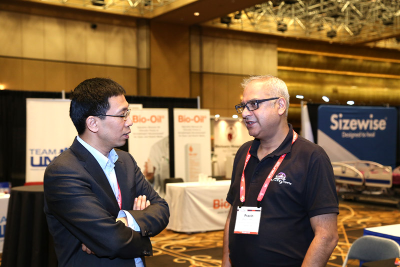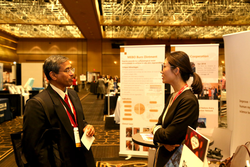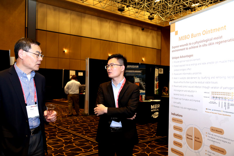 會議期間,許多美寶的老朋友們到訪展臺,詢問美寶近況,關(guān)心燒傷再生醫(yī)學(xué)世界范圍內(nèi)的發(fā)展。其中來自美國俄克拉何馬州(Oklahoma)的Dr. Paul Silverstein是美寶近30年來的老朋友(1972年間參與美國越戰(zhàn)士兵治療并獲得美國Meritorious Service Medal獎?wù)拢?,如?0多歲高齡的他依然記得徐榮祥大夫在美國的演講,記得2003年John A. Boswick論壇上與美寶的深切交流(注:John A. Boswick Symposium是美國燒傷界最知名的論壇之一,1977年開始每年2月份在美國夏威夷舉行),深切希望美寶技術(shù)和產(chǎn)品能夠在美國盡快得到應(yīng)用。同時,來自中國、印度、卡塔爾、土耳其、約旦、印尼及馬來西亞等國、應(yīng)用美寶濕潤燒傷膏多年的醫(yī)療專家也到訪了展臺,紛紛詢問美寶在美國的注冊進展。