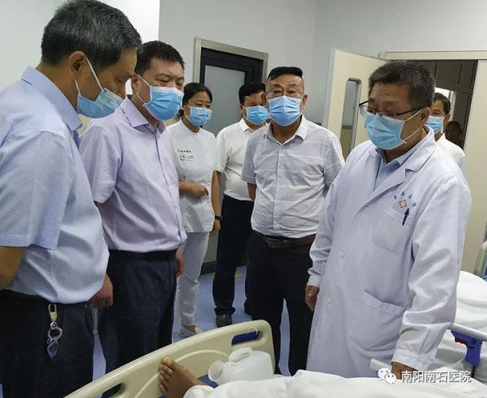 2020年8月19日,第三個(gè)“中國醫(yī)師節(jié)”,美寶集團(tuán)總裁楊智斌、醫(yī)療部主任楊軍及美寶河南省總經(jīng)理趙俊國等在南石醫(yī)院院長趙俊祥、副院長李天宇陪同下來到南石醫(yī)院燒傷整形中心、難愈創(chuàng)面治療中心、康復(fù)中心等慰問臨床一線醫(yī)護(hù)工作者,看望重度燒傷、慢瘡患者,播撒愛心,情暖醫(yī)患。
