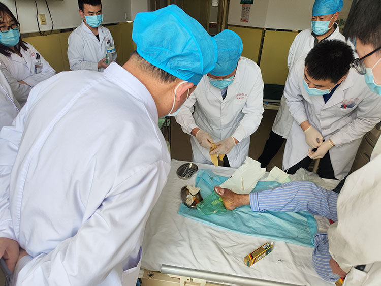 2023年3月13日,中國中西結(jié)合學(xué)會燒傷專業(yè)委員會醫(yī)療部張強教授應(yīng)邀到湖北省荊州市江陵縣人民醫(yī)院會診多例慢創(chuàng)病人,張教授親自示范換藥操作,同時給醫(yī)生做細致的講解,并對后期治療提出合理方案,得到了李明醫(yī)生的高度認可。