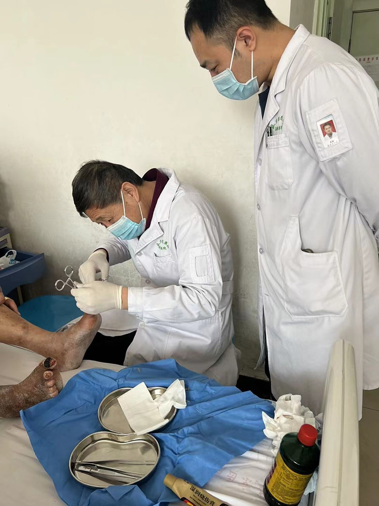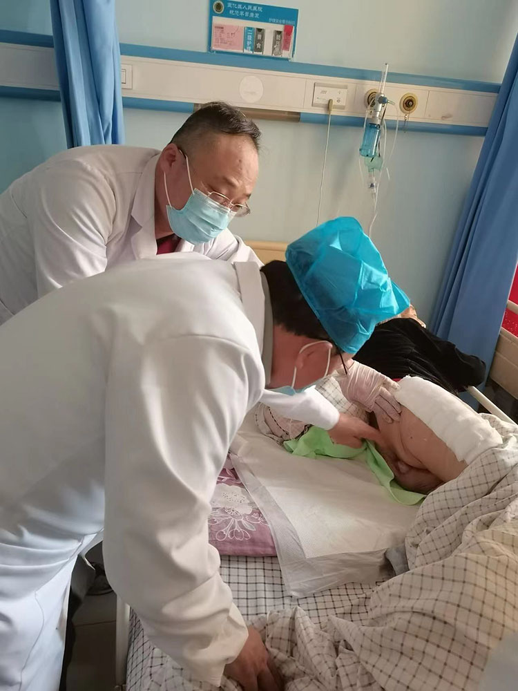 2023年3月27日,應(yīng)南陵縣縣醫(yī)院腦外科萬(wàn)國(guó)武主任邀請(qǐng),中國(guó)中西醫(yī)結(jié)合學(xué)會(huì)燒傷專(zhuān)業(yè)委員會(huì)醫(yī)療部張強(qiáng)主任會(huì)診了幾例難愈合創(chuàng)面患者,現(xiàn)場(chǎng)指導(dǎo)換藥并油紗制作,指導(dǎo)臨床全身用藥。后期還給主任及護(hù)士長(zhǎng)分享了運(yùn)用再生醫(yī)療技術(shù)治療創(chuàng)面的成功病例,講解換藥要點(diǎn),得到大家一致高度認(rèn)可!