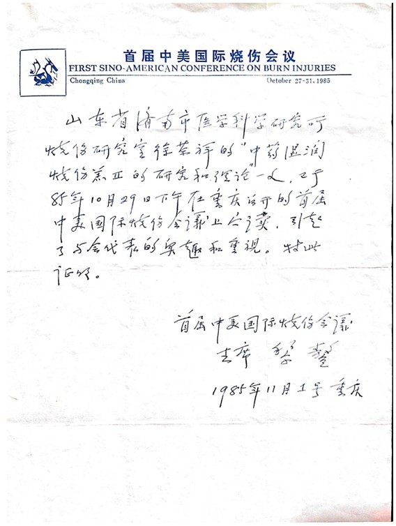 3、1985年10月,發(fā)明人出席重慶首屆中美國(guó)際燒傷會(huì)議,發(fā)表了濕潤(rùn)燒傷膏的研究論文,盛志勇主持會(huì)議,引起與會(huì)者重視,大會(huì)主席黎鰲教授寫出證明信函,望山東省支持徐榮祥的燒傷研究,隨之濟(jì)南市衛(wèi)生局誹謗是假信。(原件一直保留,只給他們看,沒(méi)交給他們,以下是原件)從此矛盾激化。衛(wèi)生局黨委發(fā)出最后通知,1986年8月31日,在局黨委書記辦公室寫了辭職報(bào)告(1986年9月1日,國(guó)家發(fā)布科技人員可辭職的文件生效日)。