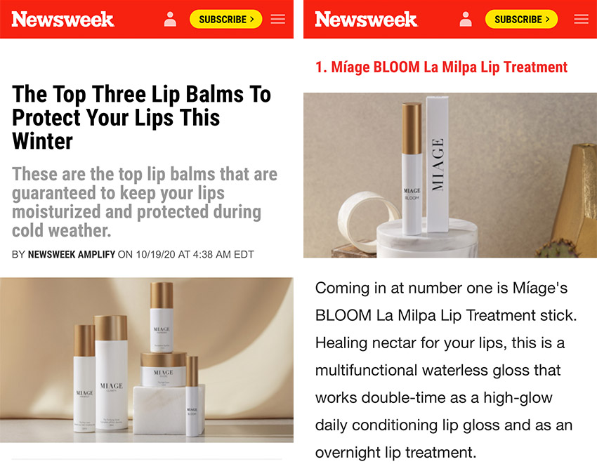 當(dāng)?shù)貢r(shí)間2020年10月19日,美國(guó)《新聞周刊》發(fā)文推薦秋冬季最值得擁有的三種護(hù)唇膏,排在首位的是被譽(yù)為唇部甘露的BLOOM多功能護(hù)唇膏,美寶集團(tuán)美國(guó)新品MIAGE系列之核心產(chǎn)品。