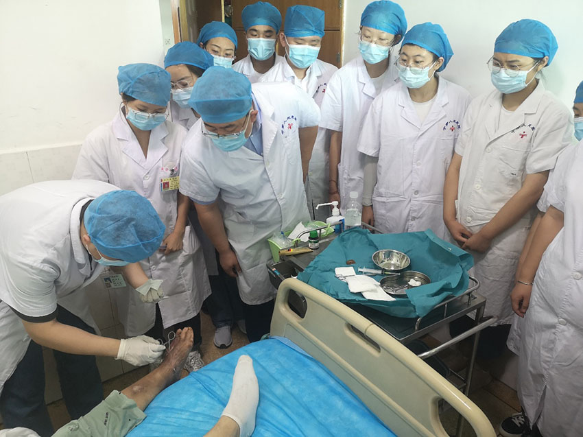第二天大家繼續(xù)前往達(dá)郫都區(qū)人民醫(yī)院進(jìn)行了交流與學(xué)習(xí),享受國務(wù)院特殊津貼專家、成都市郫都區(qū)人民醫(yī)院燒傷創(chuàng)瘍科學(xué)術(shù)帶頭人付子俊教授帶領(lǐng)大家查房并對病人案例一一分析講解;科室主任也特別給濱醫(yī)學(xué)子講述了大面積燒傷和深度潰瘍的治療等。