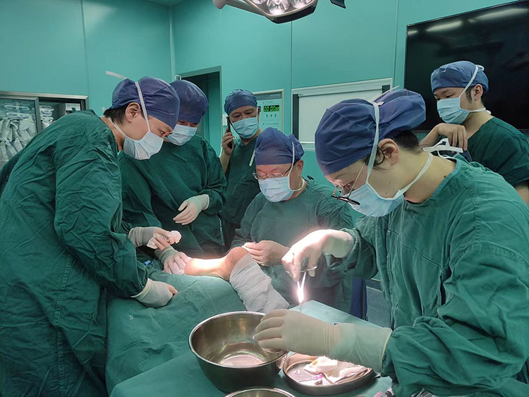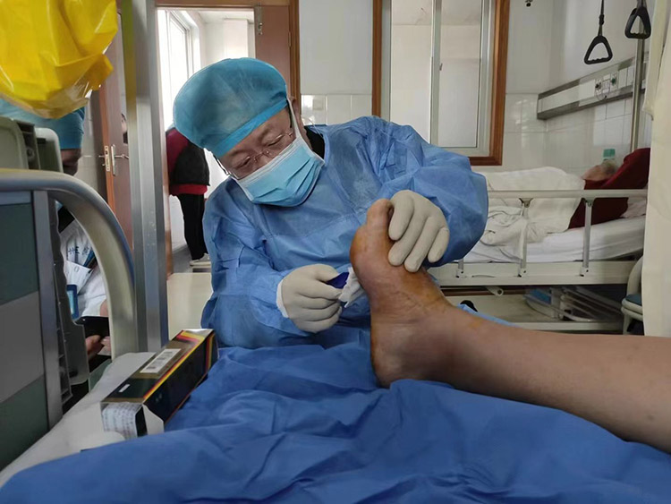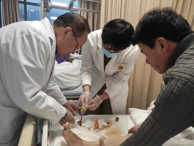 1月29日,《中國燒傷創(chuàng)瘍雜志》常務(wù)編委、燒傷創(chuàng)瘍再生醫(yī)療技術(shù)臨床專家趙瑞慶教授,應(yīng)通州區(qū)第三人民醫(yī)院的再次邀請,運用再生醫(yī)療技術(shù)分別會診了四級糖尿病足潰瘍患者和長期服用抗凝藥物,摔傷后致右下肢脛前皮膚破潰感染的患者。事后與當?shù)蒯t(yī)務(wù)人員詳細制定進一步治療計劃,糖足潰瘍患者聽到右足能夠保住的喜訊,流下了感激的淚水。