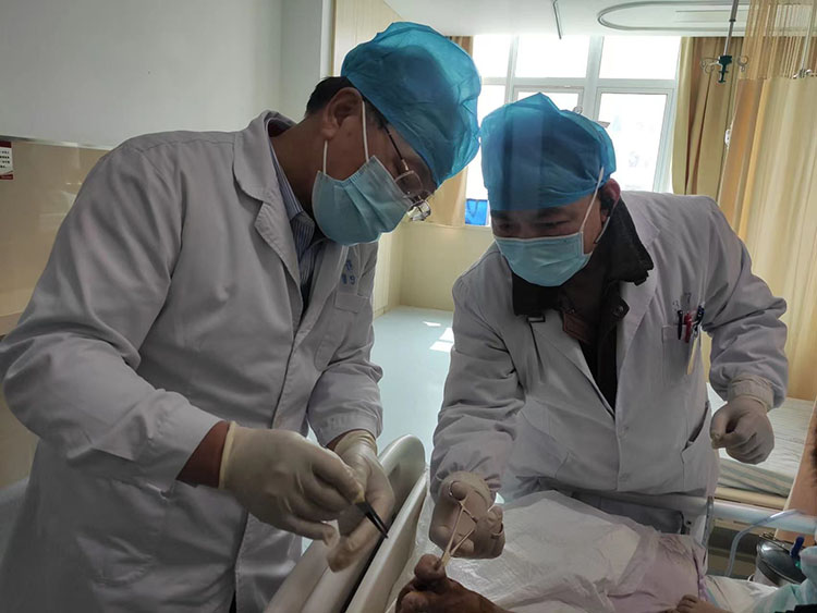 4月6日,北京榮祥再生醫(yī)學研究所副所長、中國中西醫(yī)結(jié)合學會燒傷專業(yè)委員會常務委員、《中國燒傷創(chuàng)瘍雜志》副總編輯、應用燒傷創(chuàng)瘍再生醫(yī)療技術(shù)治療糖尿病足領域?qū)<彝鹾樯魅螒椅骺h第二人民醫(yī)院外一科邀請,蒞臨科里會診一例高齡偏癱康復期壓瘡患者,并示范規(guī)范換藥流程!之后給科里醫(yī)護人員授課再生醫(yī)療技術(shù)在慢性創(chuàng)面壓瘡、糖足的治療新進展,得到醫(yī)護人員的高度認可,取得了良好的效果!