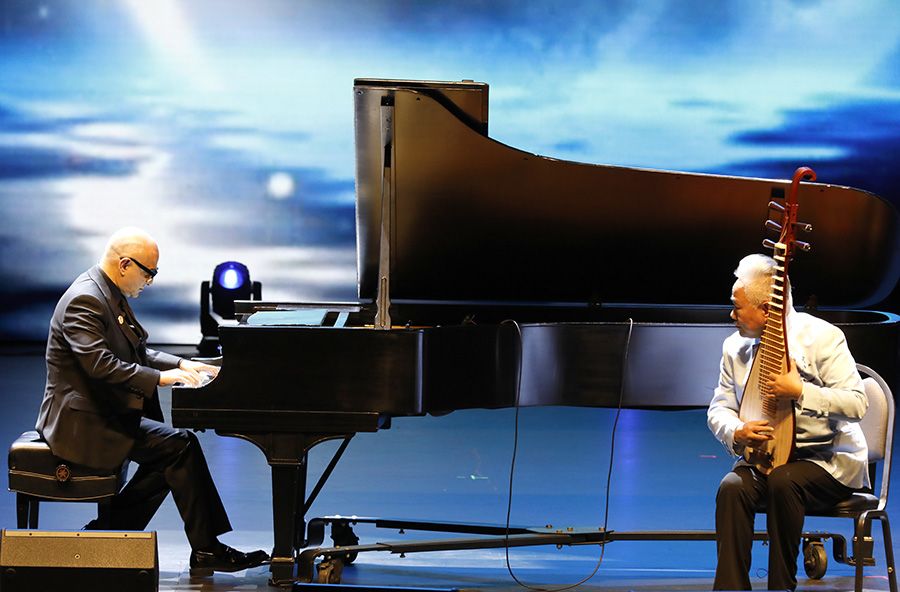 作為晚會(huì)亮點(diǎn)之一,格萊美音樂(lè)大獎(jiǎng)得主奧瑪爾攜手中國(guó)國(guó)樂(lè)界的泰斗方錦龍,共同登臺(tái),開(kāi)啟了一場(chǎng)跨越東西、融匯古今的音樂(lè)盛宴與深度對(duì)話。奧瑪爾先以他的經(jīng)典之作《Take My Hand》為引子,引領(lǐng)全場(chǎng)觀眾穿越至一個(gè)絢爛多彩、異域風(fēng)情濃厚的音樂(lè)幻境。隨后,他與方錦龍攜手合作,以《玄鳥(niǎo)》為曲目巧妙地將中西樂(lè)器之聲交織在一起,展現(xiàn)了兩種文化和諧共生、交相輝映的獨(dú)特藝術(shù)魅力。緊接著,方錦龍?jiān)僖砸磺?dú)奏《春江花月夜》將晚會(huì)推向了高潮。那悠揚(yáng)婉轉(zhuǎn)的旋律展現(xiàn)了國(guó)樂(lè)的深邃意境與無(wú)窮魅力,深深觸動(dòng)了每一位聽(tīng)眾的心弦。