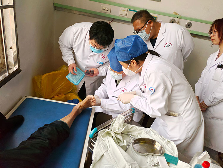 4月9日,應(yīng)大名縣醫(yī)院之邀,《中國(guó)燒傷創(chuàng)瘍雜志》常務(wù)編委、燒傷創(chuàng)瘍?cè)偕t(yī)療技術(shù)臨床專(zhuān)家趙瑞慶,在該院骨科病區(qū)、內(nèi)分泌病區(qū),使用再生醫(yī)療技術(shù)連續(xù)會(huì)診了七例患者(糖足潰瘍4例、靜脈曲張潰瘍1例、足跟跟腱感染1例、髕骨骨折術(shù)后切口感染)。事后在醫(yī)辦室逐個(gè)病案展開(kāi)討論點(diǎn)評(píng),并且制定岀詳細(xì)的治療方法,受到當(dāng)?shù)蒯t(yī)護(hù)人員家屬的熱情稱贊。