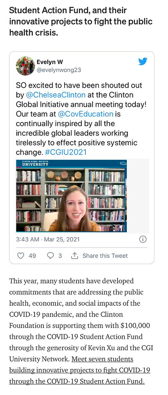 • 切爾西·克林頓著重介紹了CGI U “ 新冠病毒學(xué)生行動(dòng)基金”的成員及其抗擊公共衛(wèi)生危機(jī)的創(chuàng)新項(xiàng)目。2021年,許多學(xué)生已作出承諾,應(yīng)對(duì)COVID-19大流行對(duì)公共衛(wèi)生、經(jīng)濟(jì)和社會(huì)的影響,克林頓基金會(huì)通過(guò)Kevin Xu(徐鵬)和CGI U大學(xué)網(wǎng)絡(luò)的慷慨捐助,通過(guò)COVID-19學(xué)生行動(dòng)基金向他們提供了10萬(wàn)美元支持。