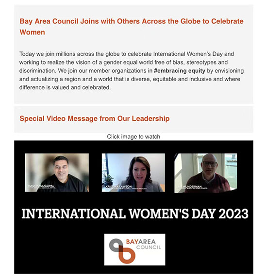 2023年3月8日,國際勞動婦女節(jié),舊金山灣區(qū)委員會(Bay Area Council)特意舉辦慶?;顒樱埰涑蓡T組織共同“擁抱公平”,接受并尊重差異,為實現(xiàn)一個沒有偏見、陳規(guī)成見和歧視的性別平等世界的愿景而努力,以期構(gòu)建一個多元化、公平和包容的地區(qū)和世界。