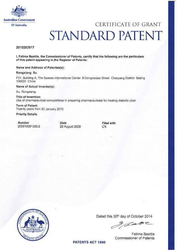 2015年2月,美寶世界知識產(chǎn)權(quán)發(fā)展進(jìn)程中又獲喜訊,徐榮祥教授的“藥物組合物在制備治療糖尿病潰瘍藥物中的用途”再獲澳大利亞專利。